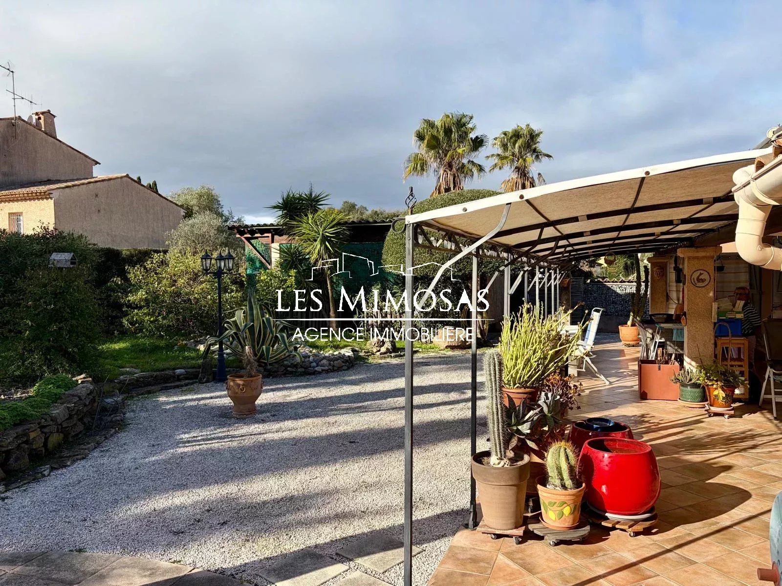 Un garage, deux abris voiture, grande terrasse couverte.