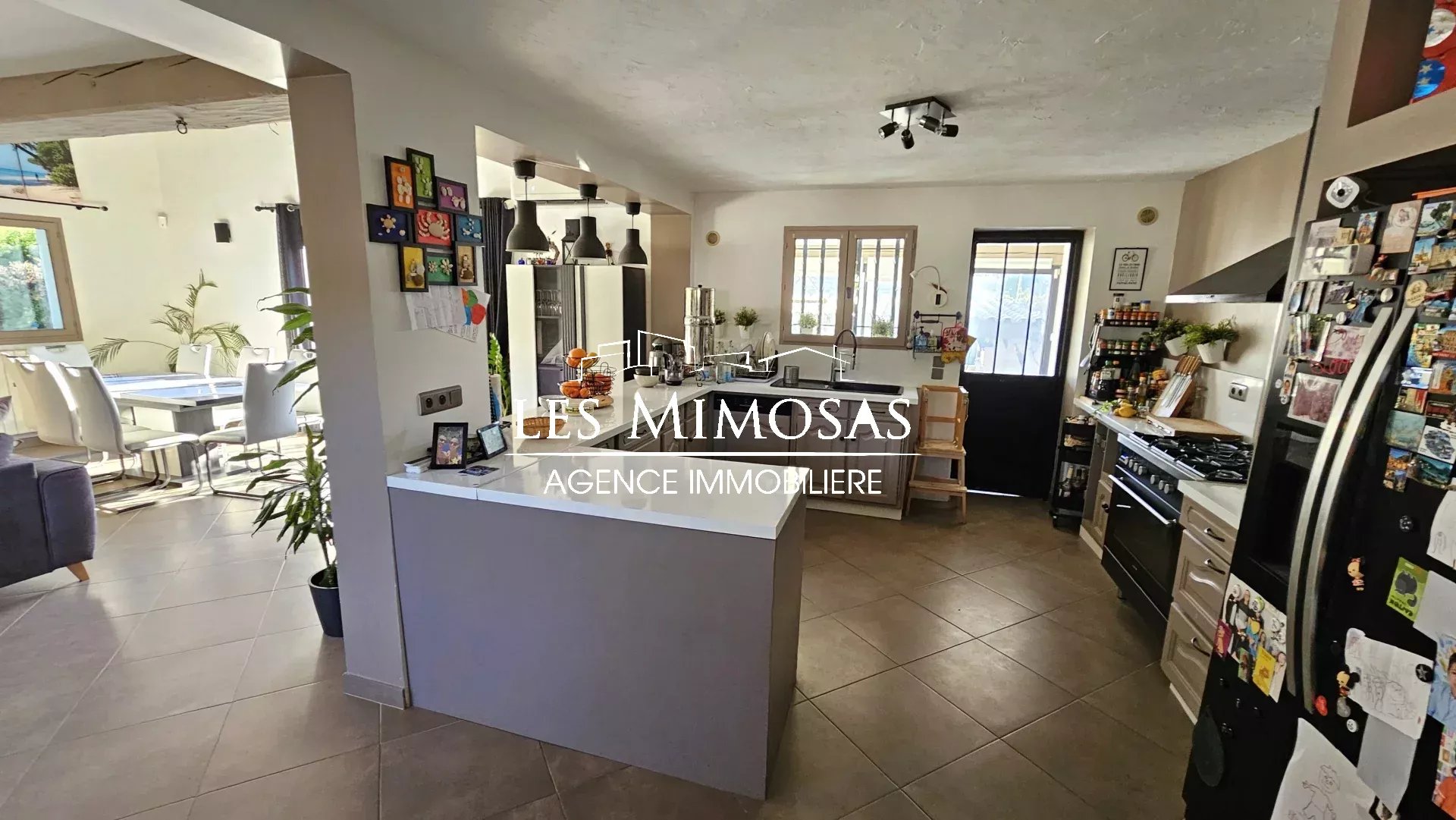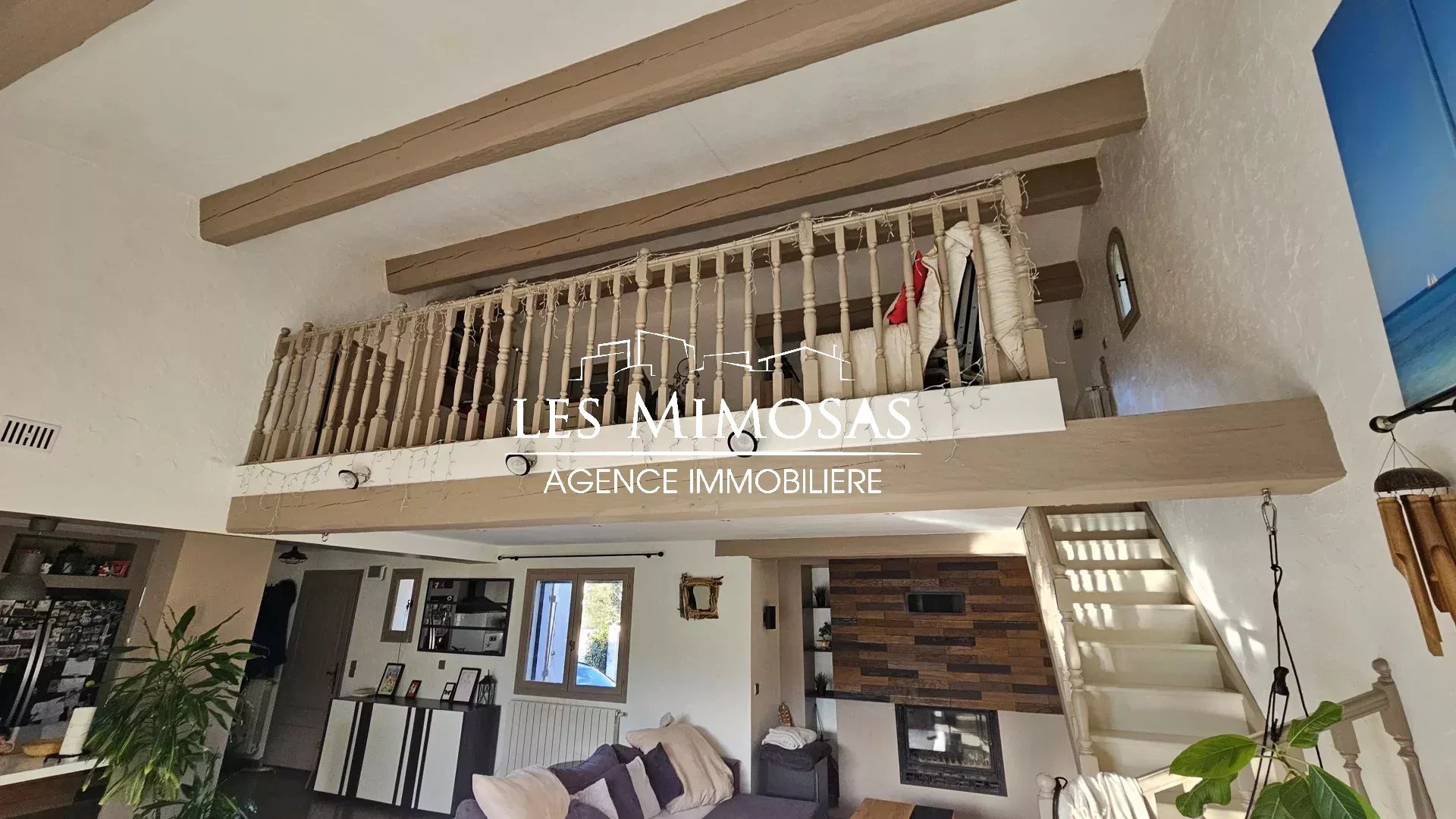 Grande cuisine équipée ouverte sur un séjour cathédrale avec cheminée, une mezzanine très utile pour un espace bureau, une véranda permettant d'accéder à une véritable cuisine d'été ombragée pour recevoir tout en profitant pleinement du jardin.