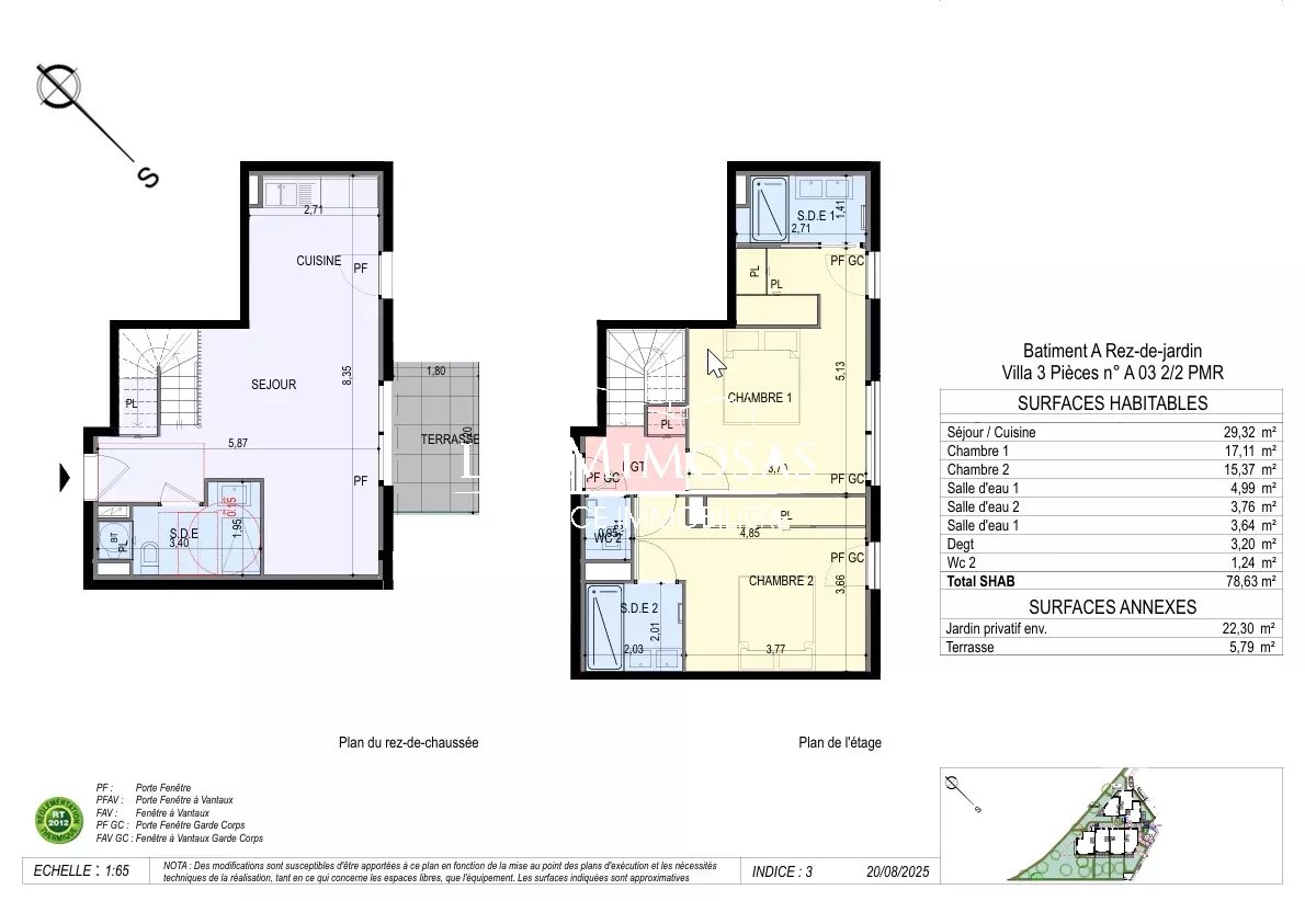 Grande pièce de vie ouvrant sur sur la terrasse et le jardin, salle d'eau/WC, à l'etage, 2 chambres en suite avec placards, et chacune sa salle de douche.